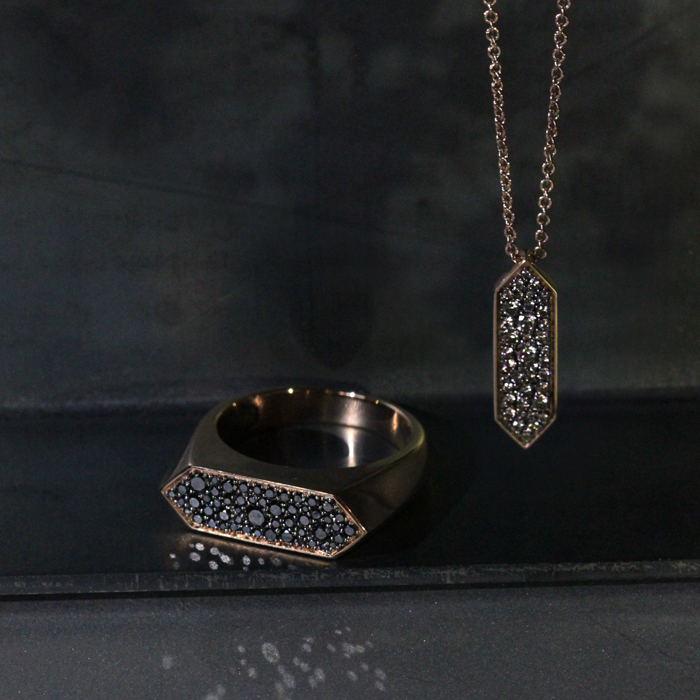 Conjunto de sortija y colgante en oro rosa de 18kts con diamantes negros y Brown